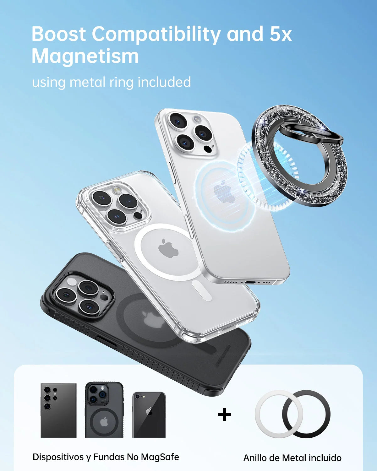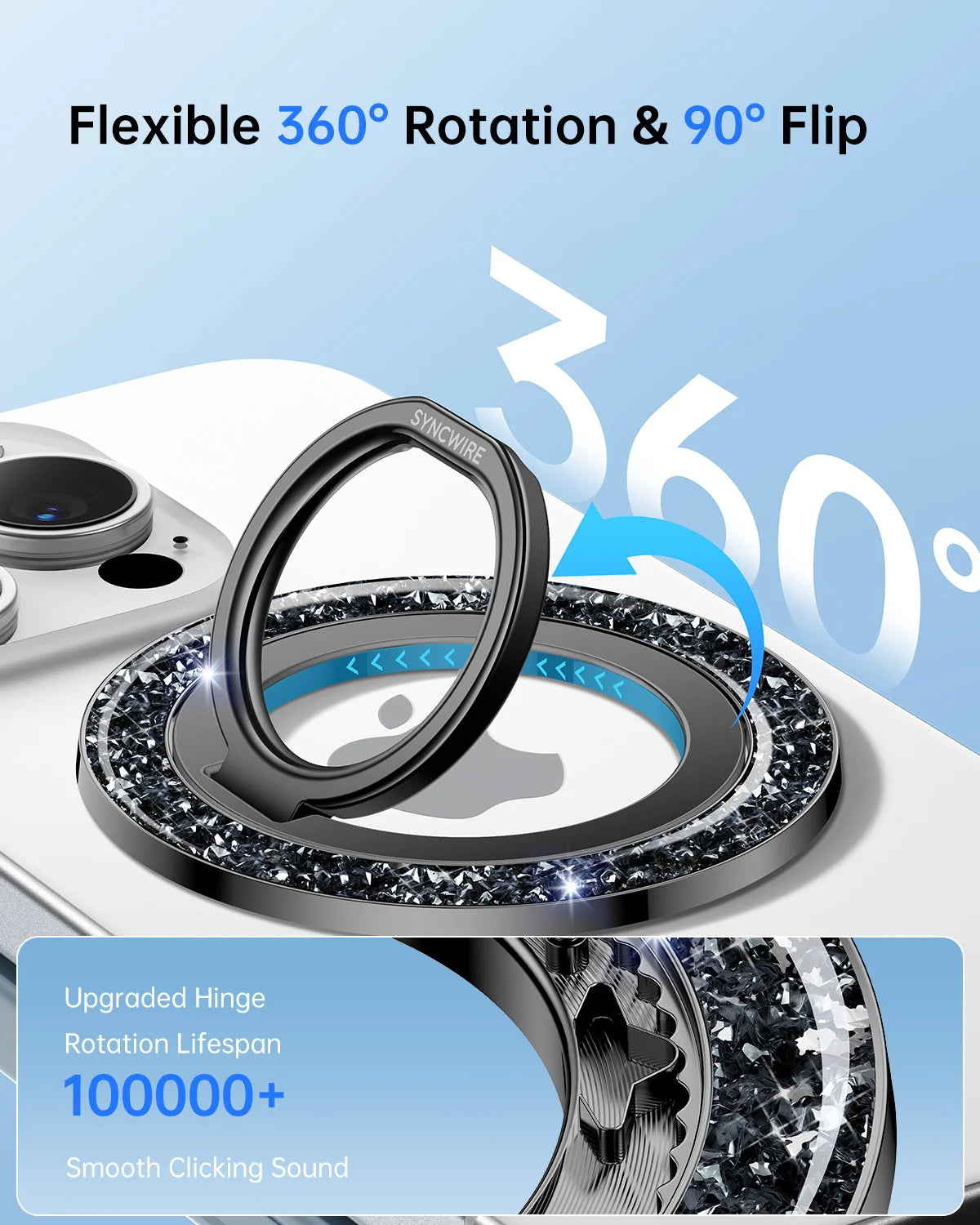 - Super Strong Magnetic: The Syncwire Glitter Magnetic phone ring holder is made with N55 NdFeB magnets, providing exceptional magnetic force. You can securely attach your phone to the MagSafe magnetic phone ring holder with just one finger, experiencing a strong hold that resists shaking or movement. The magnetic force can be enhanced by 5 times when used with the provided metal ring.